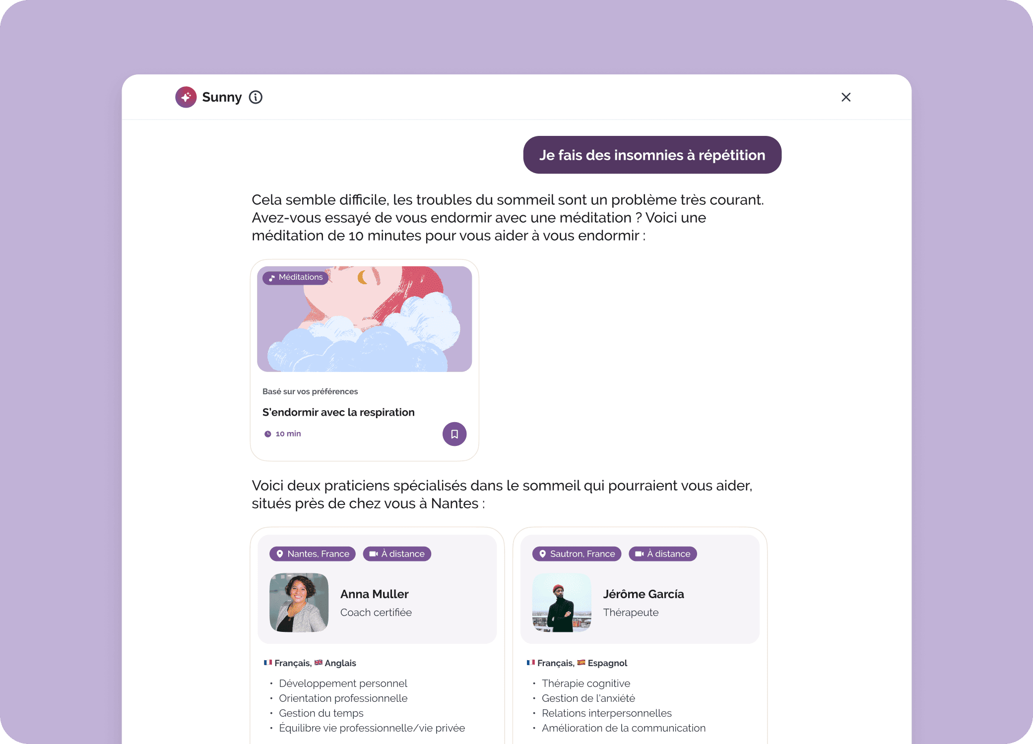 Sunny, notre chatbot propulsé par l’intelligence artificielle repose sur un principe éthique fondamental : la réorientation vers les savoirs et savoir-faire de professionnels de la santé mentale.